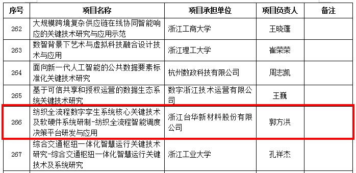 臺(tái)華新材“紡織全流程數(shù)字孿生系統(tǒng)核心關(guān)鍵技術(shù)及軟硬件系統(tǒng)研制 -紡織全流程智能調(diào)度決策平臺(tái)研發(fā)與應(yīng)用” 獲得浙江省2024年度“領(lǐng)雁”研發(fā)攻關(guān)計(jì)劃項(xiàng)目立項(xiàng)