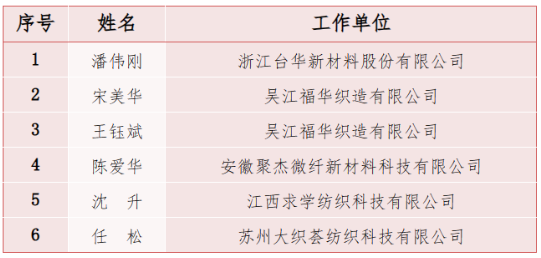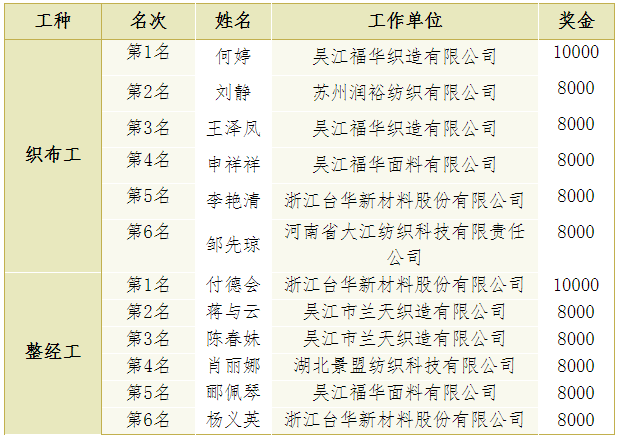 (2)織布和整經(jīng)第7-18名授予“全國長絲織造行業(yè)技術(shù)能手”榮譽稱號,具體名單如下: